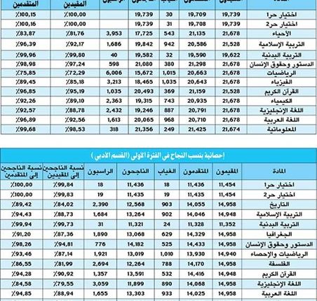 ومن خلال جدول باحصائية الرسوب والنجاح التي اعلنت عنها الوزارة، يتضح ان نسبة النجاح تجاوزت الـ 90%، وبلغت نسبة النجاح في مادة التاريخ 89.42% وفي مادة التربية الاسلامية بلغت 94.43% وفي مادة الجغرافيا بلغت 91.20% وفي مادة الرياضيات بلغت 93.46% وفي مادة الفلسفة 86.55% وفي مادة اللغة العربية 94.85% وفي الانجليزية 84.58% وفي الفرنسية بلغت 85% في حين كانت النسبة بمادة المعلوماتية 99.55%.