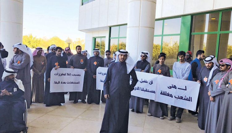 نظم الاتحاد العام لطلبة ومتدربي الهيئة العامة للتعليم التطبيقي والتدريب، اعتصاماً طلابياً، أمس، احتجاجاً على الشعب الدراسية المغلقة، مطالبين بالسماح لهم باستكمال جداولهم الدراسية.