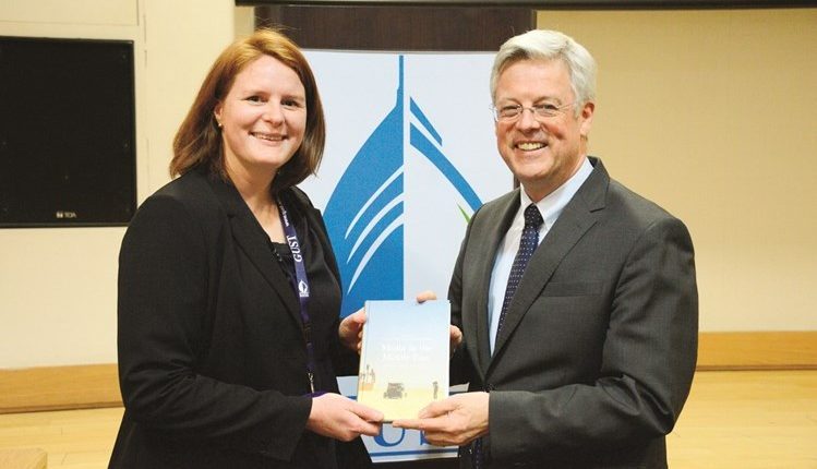 وترأست المحاضرة الأستاذ المساعد الزائر من جامعة سنغافورة الوطنية، وعضو هيئة التدريس حاليا في قسم الإعلام والاتصال الجماهيري في جامعة الخليج للعلوم والتكنولوجيا د.نيل لينزي، حيث عرضت خلالها كتابها الجديد بعنوان «الإعلام في الشرق الأوسط – النشاطية والسياسة والثقافة».