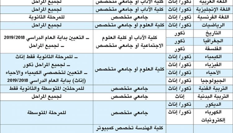 حددت وزارة التربية احتياجاتها من أعضاء الهيئة التعليمية الكويتيين من غير خريجي كليتي التربية والتربية الأساسية للعام الدراسي القادم 2019/2018 في 18 مادة من الذكور والإناث لمختلف المراحل الدراسية، وذلك وفقا للجدول المرفق.