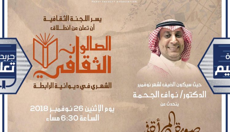 يسر اللجنة الثقافية برئاسة د.يوسف العنزي @dryalenezi ان تدعوكم لحضور صالونها الثقافي الشهري في ديوانية الرابطة في العديلية ضيف الصالون الثقافي الاول د.نواف الجحمة الحديث عن واقع المرأة في رحلة ابن المجاور #التطبيقي #paaet @PaaetFaculty