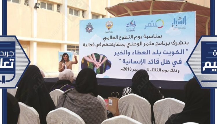 بحضور مدير عام منطقة العاصمة التعليمية بدرية الخالدي ومختار منطقة الشامية إبراهيم المشعل، أقامت ثانوية الجزائر بنات فعاليتين، الأولى بعنوان «نحميها التطوعي» والثانية والتابعة لبرنامج مثمر الوطني بعنوان «الكويت بلد العطاء والخير في ظل قائد الإنسانية»، وذلك بمناسبة يوم التطوع العالمي.