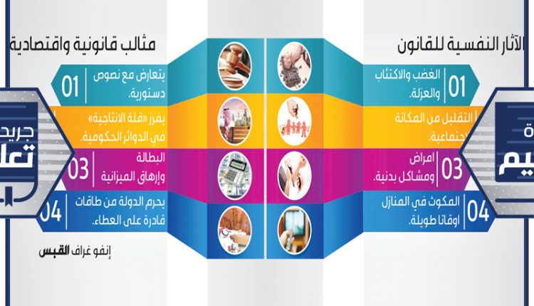 وذكروا أن من أمثلة الضرر أن القانون الجديد يخلق شواغر إدارية ويرهق اقتصاد البلاد، ناهيك عن تبعات سلبية ستنال من الصحة النفسية والجسدية للفرد.
