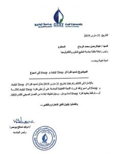 ووجهت إدارة الجامعة خطاباً إلى رابطة الخليج توضح فيه موافقة اللجنة التنفيذية للجامعة على تمديد فترة السحب والإضافة 3 أيام، واستبدال المواد مدة يومين ليصبح مجموع التسجيل أسبوعاً بدلاً من ثلاثة أيام كما كان معمولاً به في الفصل الدراسي السابق، وسيتم تطبيق القرار ابتداء من الفصل الدراسي الصيفي المقبل الذي سيبدأ منتصف مايو.