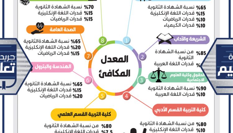 واستنادا الى مقترح عمادة القبول والتسجيل الذي وافق عليه مجلس الجامعة في اجتماعه الاخير، فقد بلغت النسب الدنيا للقبول في كل من كليتي الطب وطب الاسنان %85 في الشهادة الثانوية للقسم العلمي، و%80 لكلية الصيدلة كحد ادنى في الثانوية، و%80 للعلوم الطبية المساعدة. وحددت الشروط الاولوية في القبول في الكليات فيهما للطلبة الحاصلين على اعلى معدل مكافئ يتم احتسابه وفقا للاوزان التالية: %65 من نسبة الشهادة الثانوية، والبقية لاختبار القدرات بواقع %15 للغة الانكليزية و%10 للرياضيات و%10 للكيمياء. وفيما يتعلق بكلية الصحة العامة، فجاءت الشروط بتحديد نسبة الثانوية الدنيا للقبول %75 للقسم العلمي، بينما تكون الاولوية للحاصلين على المعدل المكافئ الاعلى وفقا للاوزان التالية: في القدرات %65 من نسبة الشهادة الثانوية، %20 من نتيجة اختبار الانكليزية و%15 لاختبار الرياضيات.