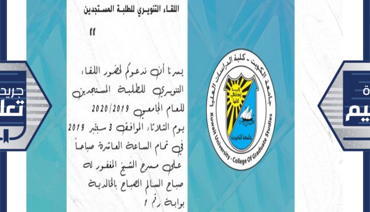 تقيم كلية الدراسات العليا بجامعة الكويت اللقاء التنويري للطلبة المستجدين للعام الجامعي 2019-2020، وذلك في تمام الساعة 10:00 من صباح يوم الثلاثاء الموافق 3 سبتمبر 2019، على مسرح الشيخ المغفور له صباح السالم – بالحرم الجامعي بالخالدية بوابة رقم (1).