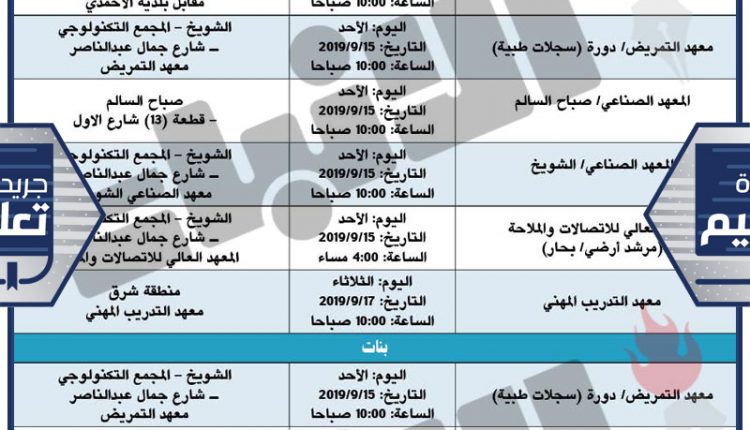 وحدد مواعيد مراجعة المستجدين لمعاهد التدريب والدورات الخاصة للفصل التدريبي الأول 2019/2020.
