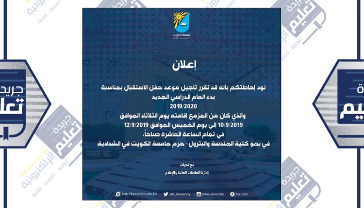 علمت مصادر ان جامعة الكويت قررت تأجيل موعد حفل استقبال العام الدراسي الجديد بمناسبة بدء العام الدراسي 2019-2020، الذي كان مقررا غدا الخميس في بهو كلية الهندسة والبترول في جامعة الشدادية حتى إشعار آخر.