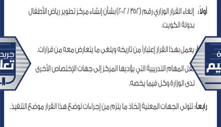 أصدر وزير التربية وزير التعليم العالي أ.د. حامد العازمي قرارا بإلغاء القرار الوزاري رقم ( ٢٠٠٢/٣٥٢) بشأن إنشاء مركز تطور رياض الأطفال بدولة الكويت وإنهاء العمل بما جاء فيه.