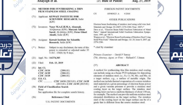 معهد الكويت للأبحاث حصل على براءة إختراع