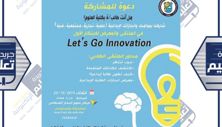 صرحت د.انتصار المضاحكة رئيسة وحدة الابتكار والتعاون الخارجي في كلية العلوم بجامعة الكويت بأن الوحدة ستنظم الملتقى والمعرض الطلابي الأول للابتكار والذي سيكون تحت رعاية عميد كلية العلوم د.عبدالهادي بوعليان، بمركز علوم البحار بالفنطاس يوم الثلاثاء الموافق 29 الجاري الساعة 5:30 مساء، حيث يهدف الملتقى إلى رفع الوعي بالابداع والابتكار والريادة وتحفيز الطالب وتسخير ابداعاته ومواهبه لتطبيقها في جميع مجالات الحياة، سواء على النطاق العلمي والأدبي الاجتماعي والتجاري والفني للمساهمة الفعالة في الارتقاء بنفسه ومجتمعه ووطنه، مما يساهم في إعداد الطالب مهاريا لتحقيق أهداف التنمية المستدامة 2030 ورؤية الكويت الجديدة 2035.