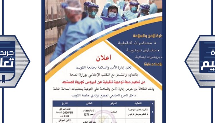فقد أعلن أن إدارة الأمن والسلامة بجامعة الكويت ممثلة في قسم السلامة بالعيادات الطبية بالتعاون والتنسيق مع المكتب الإعلامي بوزارة الصحة بصدد تنظيم حملة توعوية صحية مكثفة للطلاب والعاملين بجامعة الكويت ضد فيروس كورونا المستجد وأعراضه ومدى خطورته وطرق الوقاية منه، وذلك بداية شهر مارس المقبل بمواقع جامعة الكويت.