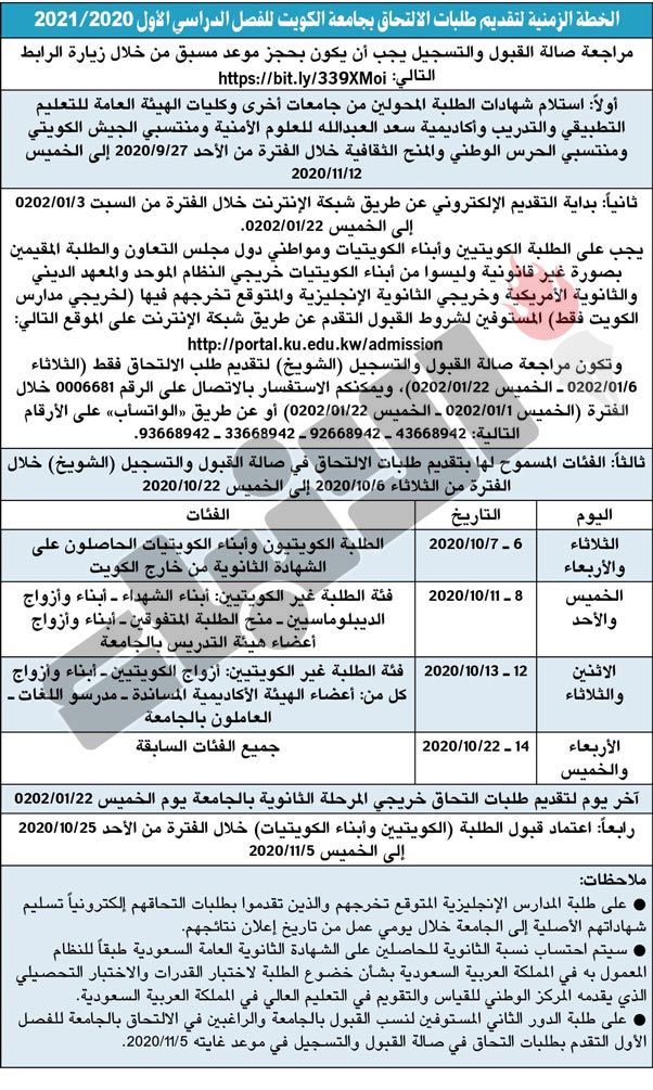 أعلنت عمادة القبول والتسجيل بجامعة الكويت أمس الأربعاء أن تقديم طلبات الالتحاق للعام الجامعي 2021/2020 ستبدأ الكترونيا للطلبة للكويتيين وأبناء الكويتيات ومواطني دول مجلس التعاون والطلبة المقيمين بصورة غير قانونية اعتبارا من 3 أكتوبر المقبل.