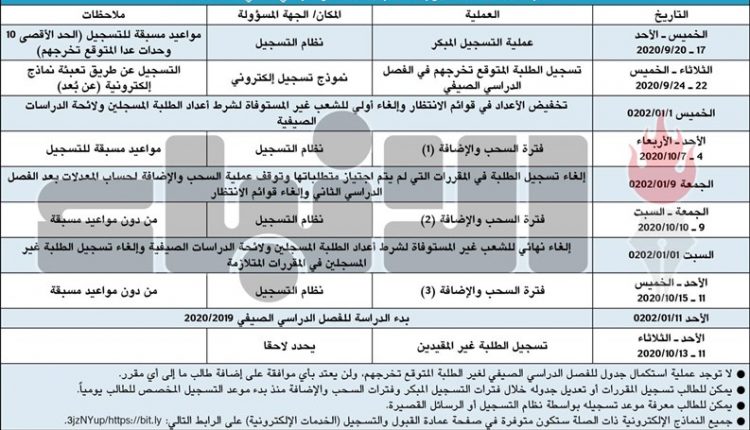 وأشار المطيري إلى ضرورة مراجعة جميع الطلبة جداولهم الدراسية للفصل الصيفي وبصفة مستمرة خاصة مساء يوم السبت الموافق 10/10/2020، موضحا أنه بذلك ستتاح الفرصة أمام الطلبة الذين ألغيت عنهم مقرراتهم لسبب ما للتسجيل في مقررات بديلة حتى يوم الثلاثاء الموافق 13/10/2020 باستخدام شبكة الإنترنت فقط، وأن على هؤلاء الطلبة إذا كانوا يرغبون في الدراسة بالفصل الصيفي ضرورة التسجيل في مقررات بديلة قبل ذلك التاريخ، علما بأنه لن يسمح لأي طالب بإضافة أي مقرر بعد هذا التاريخ.