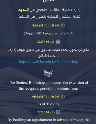 أعلنت مديرة إدارة مكتبة الطالب الجامعي نوال عبد العزيز علي عن تمديد فترة استقبال الطلبة لتكون من الساعة 9:00 صباحاً وحتى الساعة الواحدة ظهراً ، وذلك اعتباراً من اليوم الثلاثاء الموافق 2020/10/13