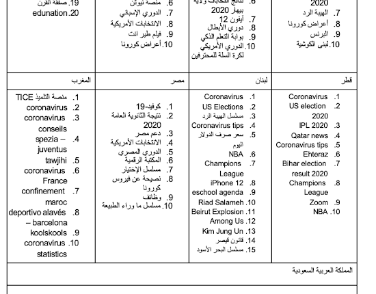 أيضاً اهتم المستخدمون في السعودة بالتعلم عن بعد والرياضة حتى في مباريات الكريكيت، وكان الشأن الأمريكي واضحاً في عمليات البحث لاسيما بشخص الرئيس ترامب أو الانتخابات الأمريكية.