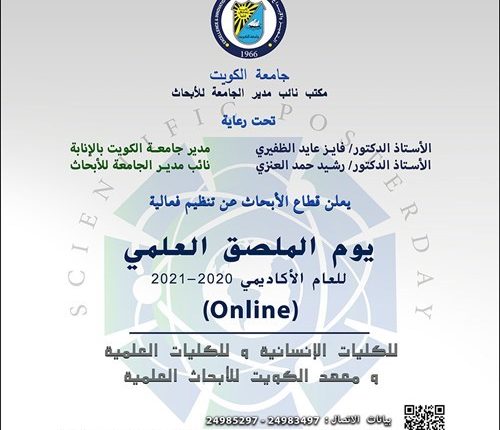 تحت رعاية مدير جامعة الكويت بالإنابة أ.د. فايز الظفيري ونائب مدير الجامعة للأبحاث أ.د. رشيد العنزي، ينظم قطاع الأبحاث ممثلاً بمكتب التعاون البحثي الخارجي والاستشارات فعالية الملصق العلمي للكليات الإنسانية والعلمية، بمشاركة باحثين من معهد الكويت للأبحاث العلمية، والمزمع عقدها خلال شهر مارس القادم 2021، على أن تكون فعالية الملصق العلمي لهذا العام إلكترونياً عن طريق عرض الملصقات العلمية عبر رابط إلكتروني موحد.