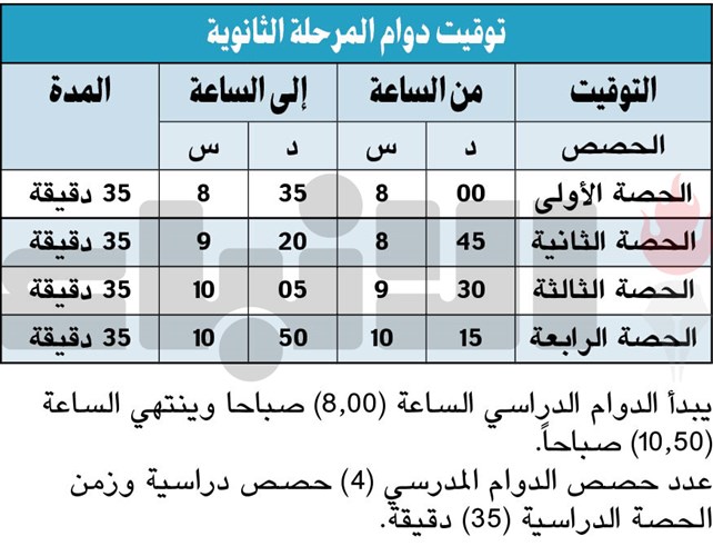 أما المرحلة الثانوية، فيرى المقترح أن الدوام الدراسي للفصل الدراسي الثاني سيبدأ من الساعة 8 صباحا حتى 10.50 صباحا، ويتكون من 4 حصص، وكل حصة زمنها 35 دقيقة.