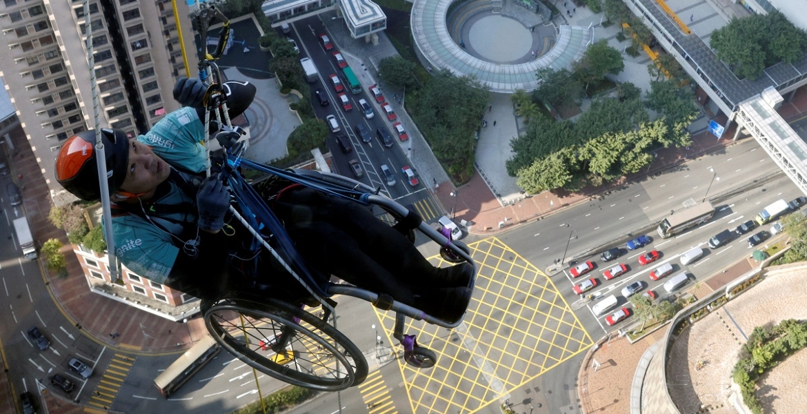 أصبح لاي تشي-واي أول رجل في هونغ كونغ يتسلق أكثر من 250 متراً، من واجهة ناطحة سحاب، وهو مربوط بكرسي متحرك، حيث استغرق أكثر من 10 ساعات لتحقيق هذا الإنجاز، السبت 16 يناير/كانون الثاني 2021، من أجل جمع تبرعات لذوي إصابات الحبل الشوكي.