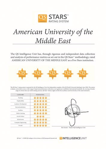 نجحت جامعة الشرق الأوسط الأمريكية (AUM) في الحصول على تقييم من 5 نجوم من مؤسسة «كواكواريلي سيموندز» – Quacquarelli Symonds (QS) العالمية.