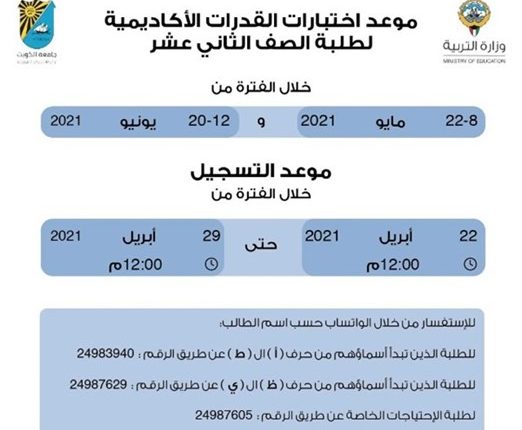 ‏ولفتت الوزارة إلى أن الاختبارات ستعقد في جامعة الكويت خلال الفترة من (8 إلى 22 مايو) ومن (12 إلى 22 يونيو)، مشيرة إلى أن الطلبة الراغبين في التقدم لهذه الاختبارات من الصف الثاني عشر أو ما يعادله وخريجي ‏الثانوية العامة يمكنهم التسجيل من خلال الصفحة: ‏‪.portal.ku.edu.kw/placement