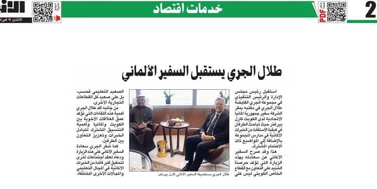 طلال الجري يستقبل السفير الألماني تم النشر بتاريخ 2021/06/16 1٬051 1٬051 مشاركة FacebookTwitterGoogle+WhatsAppالبريد الإلكترونيTelegram