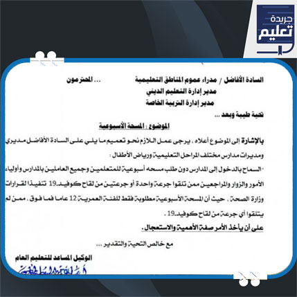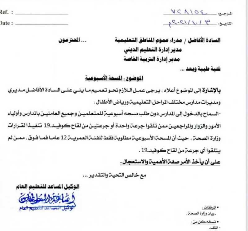 وأكد الوكيل المساعد للتعليم العام أسامة السلطان في تعميم حصلت «القبس» على نسخة منه، أن المسحة الأسبوعية مطلوبة فقط للفئة العمرية من 12 عاماً فما فوق، ممن لم يتلقوا أي جرعة من لقاح كوفيد-19.