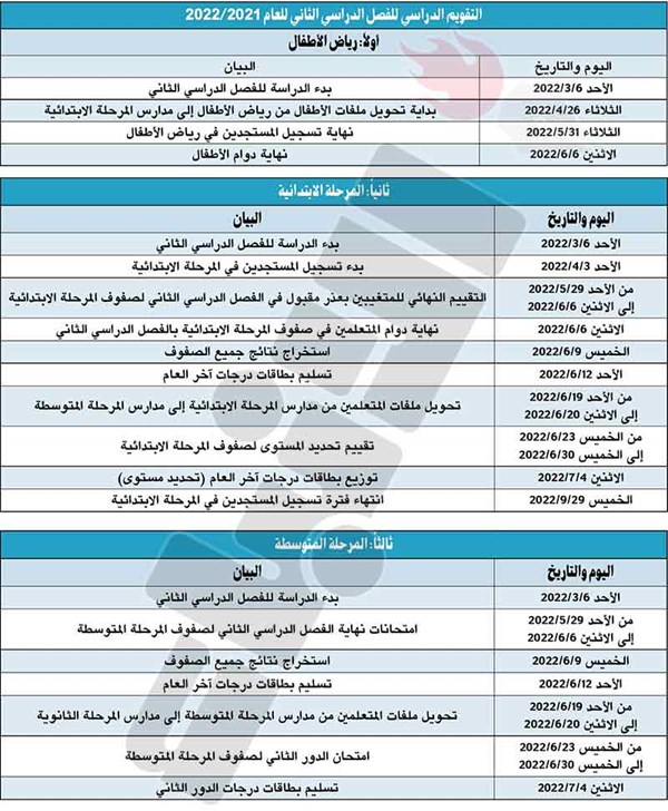 وفيما يلي جداول التقويم الدراسي المعدل: