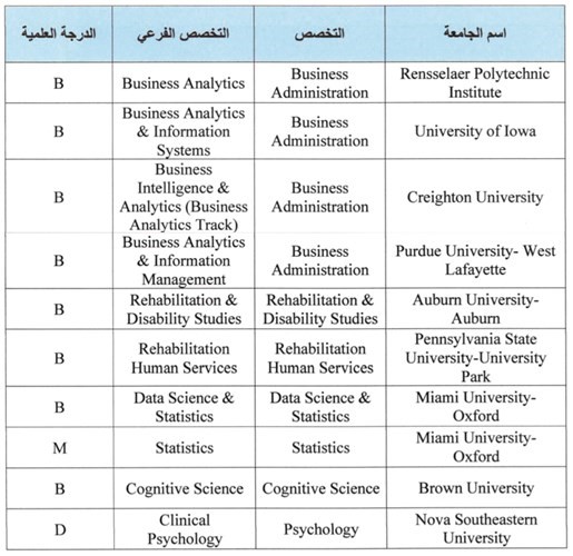 علمت مصادر مطلعة في الجهاز الوطني للاعتماد الأكاديمي وضمان جودة التعليم، أن مدير الجهاز د ..حمد العدواني أصدر قرارا بإضافة بعض البرامج الدراسية والدرجات العلمية من قائمة مؤسسات التعليم العالي في الولايات المتحدة الأميركية الموصى بها لدى الجهاز، مشيرة إلى أن هذا القرار يسري من تاريخ صدوره ويلغى كل نص يخالف ما ورد به.