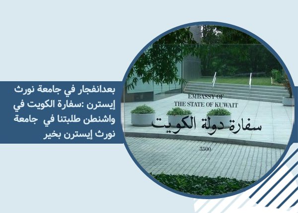 أكدت سفارة دولة الكويت في واشنطن أنه في ضوء الانفجار الذي وقع في جامعة نورث إيسترن في مدينة بوسطن في ولاية ماساتشوستس الامريكية، فقد قامت السفارة بالتواصل مع الطلبة الدارسين في هذه الجامعة وتم الاطمئنان عليهم، وتؤكد السفارة بهذا الصدد على كافة المواطنين الكرام بضرورة أخذ الحيطة والحذر دائما، والتواصل معها والقنصليات العامة على هواتف الطوارئ المخصصة لذلك على مدار الساعة.