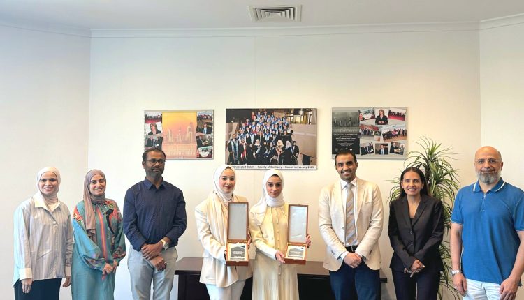 كرمت كلية طب الأسنان بمركز العلوم الطبية في جامعة الكويت الفائزين بمسابقة هاتون للأبحاث من فئة الطلبة، والتي نظمها فرع الكويت للمنظمة الدولية لأبحاث طب الأسنان KuADR وذلك برعاية القائم بأعمال عميد الكلية د. راشد العازمي وبحضور القائم بأعمال العميد المساعد للأبحاث والدراسات العليا د. فواز الزعبي، والقائم بأعمال العميد المساعد للشؤون الأكاديمية والطلابية د. مي خلف، والقائم بأعمال العميد المساعد للشؤون الإكلينيكية والاستشارات والتدريب د. جابر أكبر، والقائم بأعمال رئيس قسم العلوم السريرية والحيوية د. ماريبا كارشاد، ورئيس فرع الكويت بالمنظمة الدولية د. أقدار أكبر، وأمين السر د. إسراء الفرحان.
