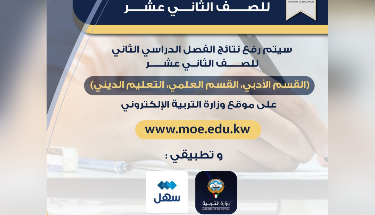 قالت وزارة التربية إنه سيتم رفع نتائج الصف الثاني عشر بعد اعتمادها على موقع وزارة التربية الإلكتروني وتطبيقي وزارة التربية وسهل بعد الساعة 11:00 صباحاً.