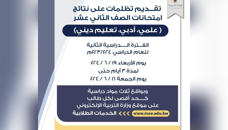 وأشارت الوزارة إلى أن تقديم التظلم يكون إلكترونيا عن طريق خدمات الوزارة على الموقع http://moe.edu.kw، ثم اختيار قائمة “طالب/ ولي أمر” وثم الدخول على خدمات طلابية واتباع الخطوات ليتم الرفع إلكترونيا.