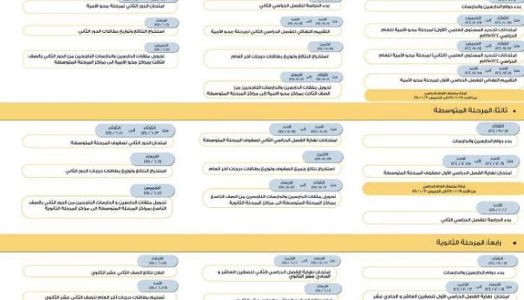 اعتمدت وزارة التربية التقويم الدراسي للعام 2024 /2025 لنظام تعليم الكبار ومحو الأمية للعاملين والمتعلمين في أقسام ومراكز تعليم الكبار ومحو الأمية بالإضافة إلى الإجازات والعطل الرسمية.