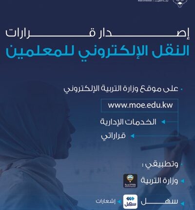 “نفيدكم بقبول طلب النقل المقدم من قبلكم… يرجى زيارة موقع وزارة التربية (الخدمات الإدارية – بياناتي – بيانات النقل) أو تطبيق الوزارة (قراراتي) للاطلاع على مركز العمل الجديد وقرار النقل بنسخة PDF خلال الأيام القادمة.”