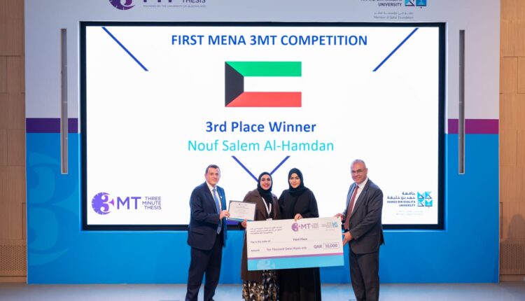 في إنجاز علمي جديد يضاف إلى رصيد الباحثين الكويتيين، أحرزت الدكتورة نوف الحمدان من جامعة الكويت المركز الثالث في مسابقة “الأطروحة في ثلاث دقائق” بنسختها الأولى في الشرق الأوسط وشمال إفريقيا، والتي أقيمت في العاصمة القطرية الدوحة بمشاركة نخبة من الباحثين من مختلف دول المنطقة.
